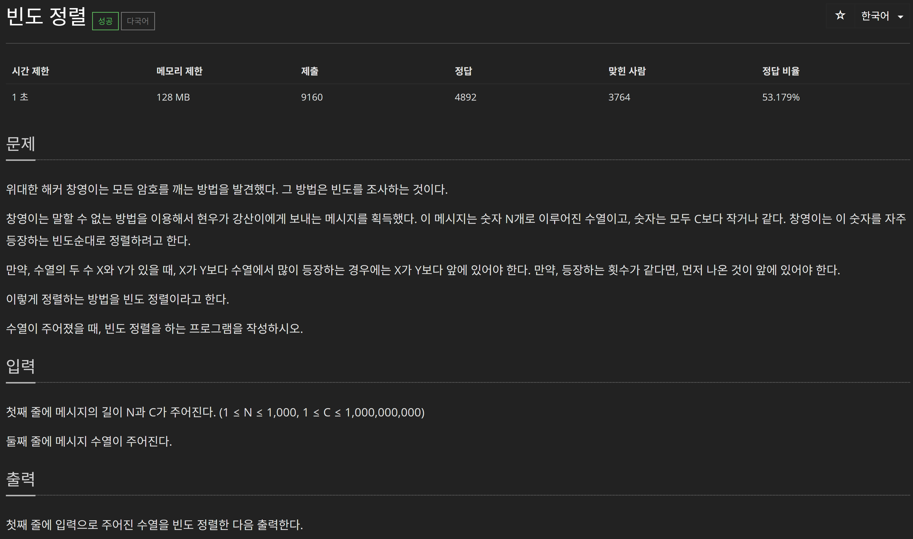 [BOJ] C++ 2910: 빈도 정렬 - 정렬 기준 만들어서 정렬하기