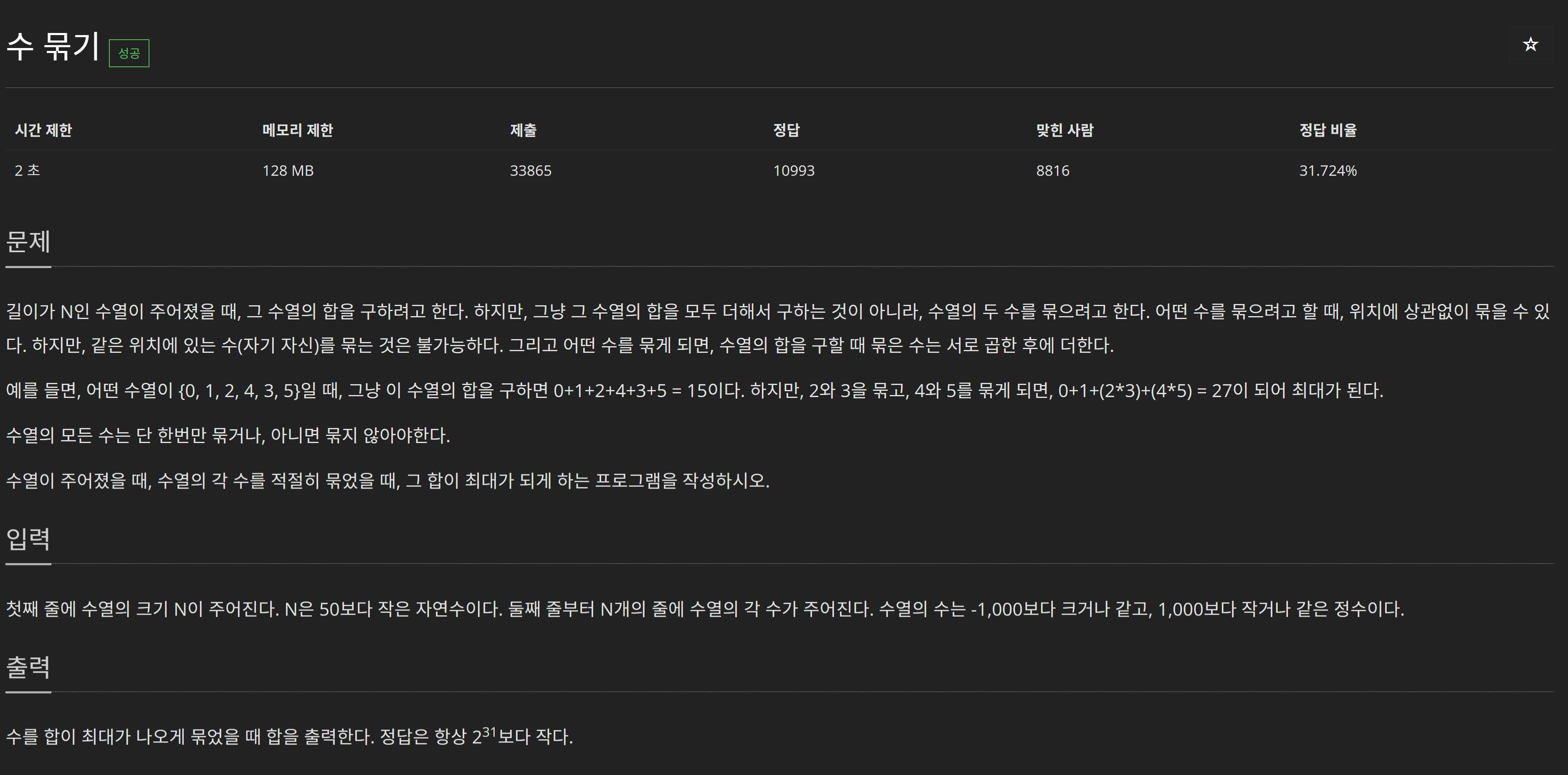 배열의 각 숫자를 위치에 관계없이 두 개씩 묶을 수도 있고 묶지 않을 수 있다. 그리고 원소들의 합을 구하는데, 묶은 수끼리는 곱하고 모든 수를 더해서 그 값이 최대가 되게 하면 된다.