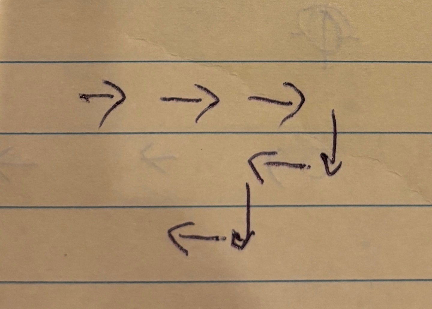 조건제한이 걸린 경로를 찾는 문제이다. 가장 먼저 떠올린 풀이는 dp [i][j]를 (i, j)까지 도달할 수 있는 경우의 수로 두고 네 방향 모두에서 (i, j)로 도달할 수 있으므로 4방향을 순차적으로 채우는 방법이었다. 이 방법은 아래와 같은 케이스를 잡아내지 못했다.