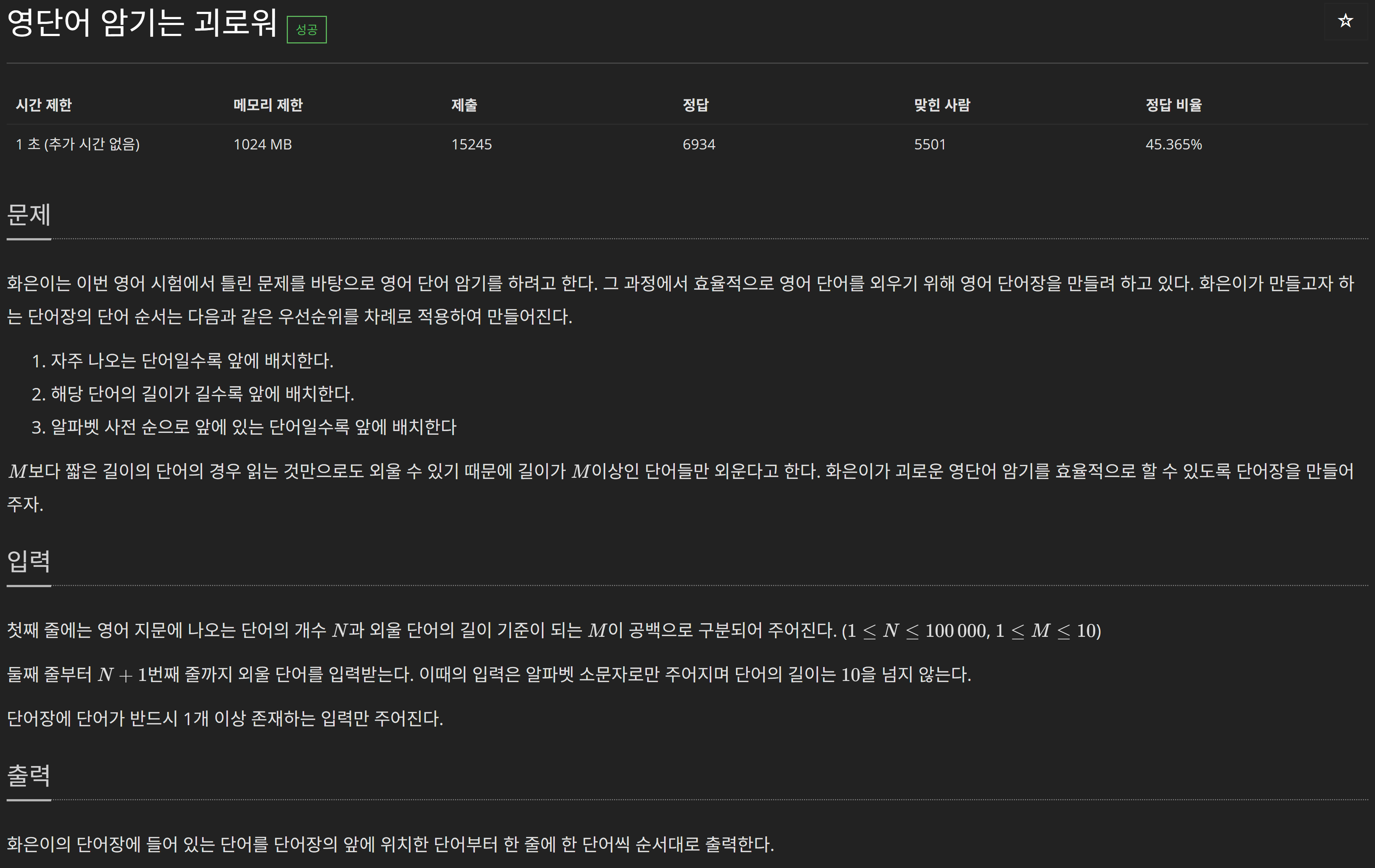 [BOJ] C++ 20920: 영단어 암기는 괴로워 - 세 가지 기준의 우선순위 큐
