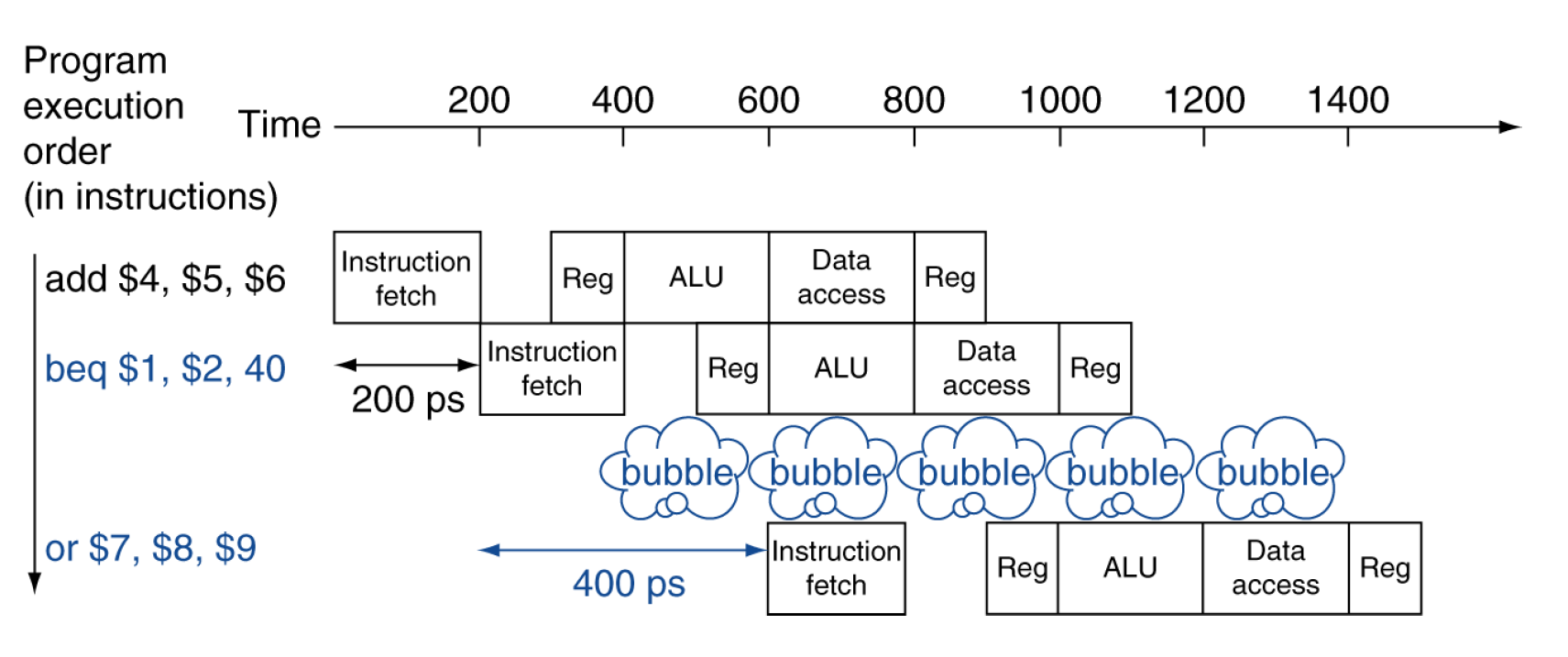 프로그램에 따라 if문이나 for문 등때문에 바로 소스 코드의 다음 라인을 수행하지 않을 수 있다. 그런 걸 branch라 하는데, branch 명령어를 만나면 pipeline은 옳은 명령어를 가져올 수 없다. branch의 조건을 판단한 후 PC값이 변경되는 것을 보고 명령어를 가져와야 하기에 버블을 사용해서 주기를 쉬어야만 한다.
