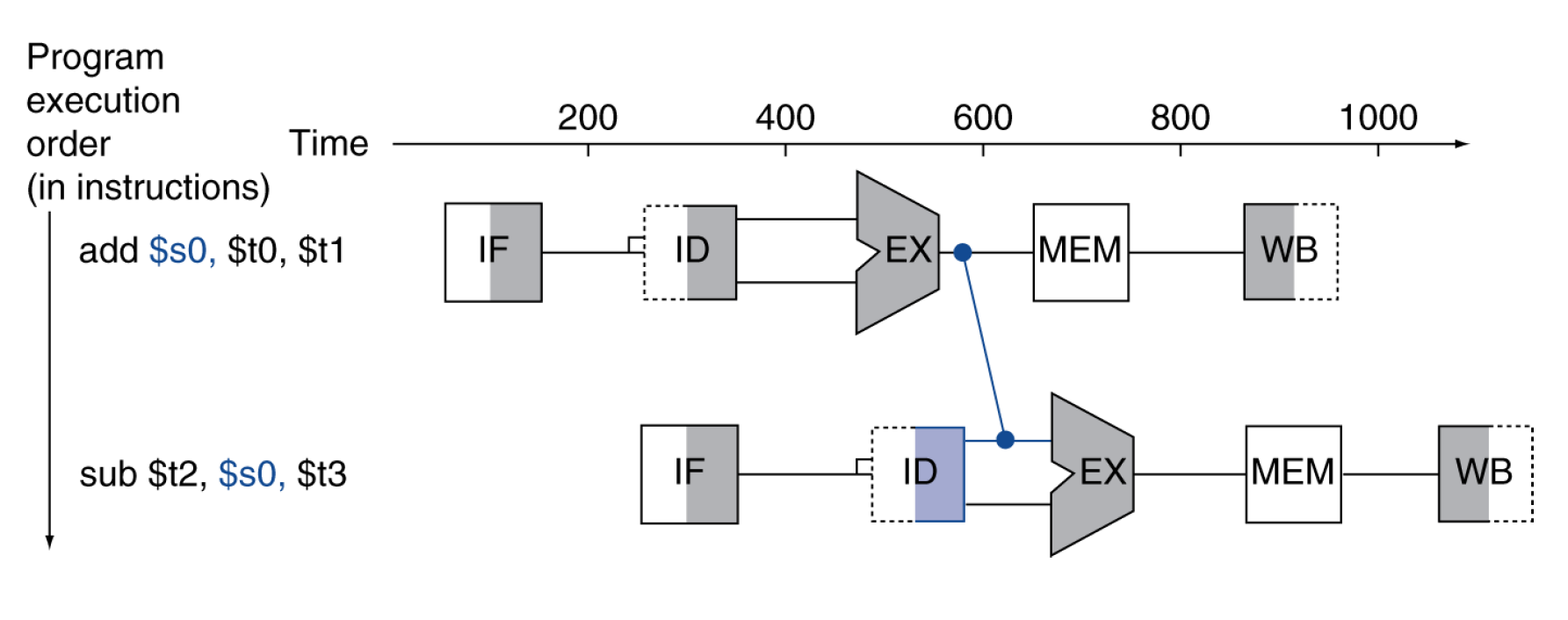 Data에 접근하는 순서때문에 생기는 위험성이다. 예를 들어 add $s0, $t0, $t1 이후 sub $t2, $s0, $t3 의 순서로 명령어가 온다면 $s0 레지스터에 add 명령에 대한 값이 쓰이기 전, 다음 sub 명령어에서 바로 $s0 에 접근하므로 문제가 생긴다. 그럼 add 명령어가 끝날 때까지 bubble을 발생시켜야 할까? bubble을 발생시키면 물론 해결 가능하지만 매우 비효율적이다.