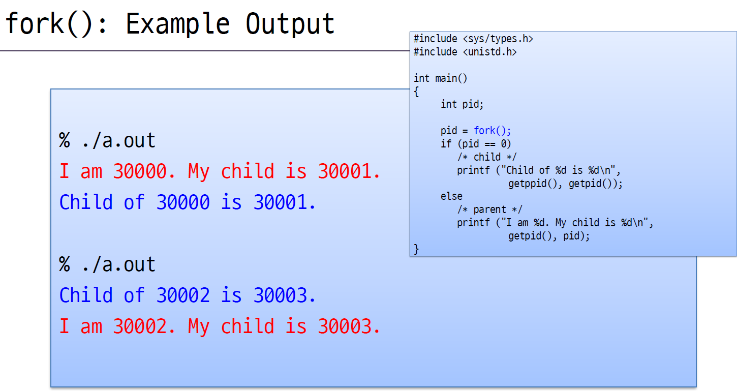 💡 참고) fork()를 부르면 항상 자식 프로세스가 만들어지진 않는다. 모든 함수는 실패할 수 있다. 메모리가 부족하거나 모든 프로세스를 다 만들어서 더 이상 만들 수 없거나 권한이 없는 등의 이유로 실패할 수 있다.