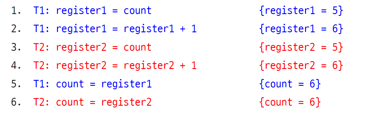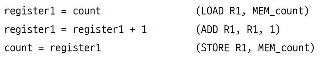 어떤 문제가 생길 수 있을까? 은행 예제와 같은 문제가 발생할 수 있다. 어셈블리어 코드 레벨에서 분석해 보자.