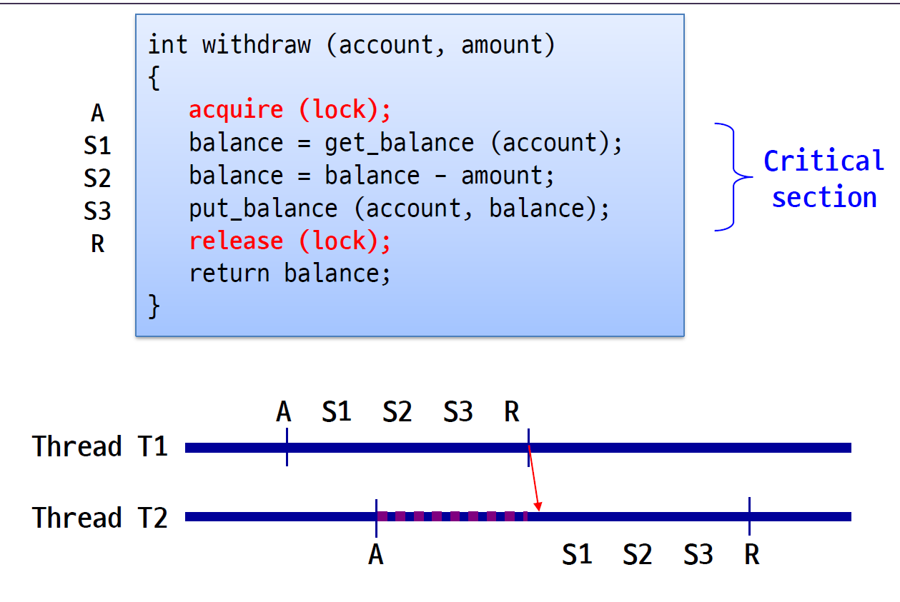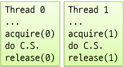acquire과 release 사이에 쓰레드는 락을 잡고 있어야 한다. 또, 최대 하나의 쓰레드만이 락을 잡고 있어야 한다.