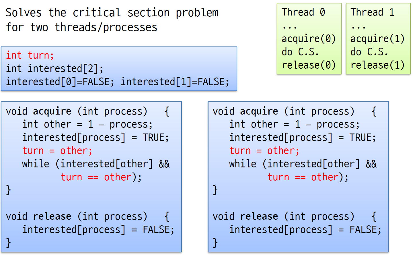어디서 context switch가 일어나던 무한 루프를 돌지 않는다. turn이 글로벌 변수여서 context switch와는 무관하게 잘 동작한다는 것이 포인트이다. 잘 이해해 보자. turn 위아래로 context를 넣어서 직접 시뮬레이션해보자.