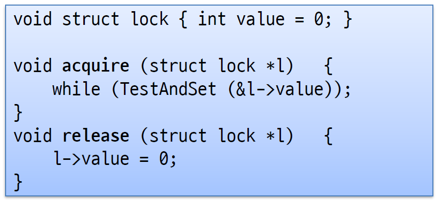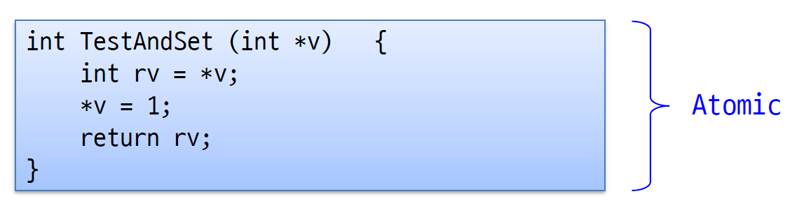 기존에 잘못된 알고리즘에서는 l.value를 확인하고 값을 바꾸는 두 과정을 거쳐서 잘못된 부분이 생겼는데, 하드웨어적으로 도움을 받아서 CPU 한 클락에 TestAndSet Atomic 하게 실행하기에 그사이에 컨텍스트 스위칭이 일어날 수 없다.