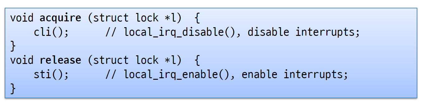 - 하드웨어적으로 지원하는 인터럽트에 대한 disable/reenable를 사용한다. 인터럽트를 받지 않는다는 말은 타이머 인터럽트를 받지 않는다는 것이고, 그럼 context switching이 일어날 리가 없다.