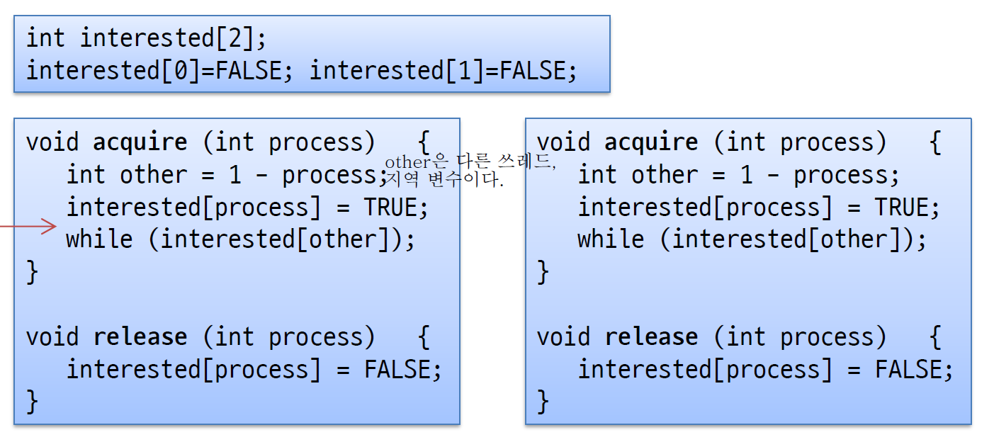빨간색 화살표의 위치에서 contextSwitch가 일어나면 어떻게 될까? T1도, T2도 interested [other] 값이 1이 되어서 무한 루프를 돌게 된다.