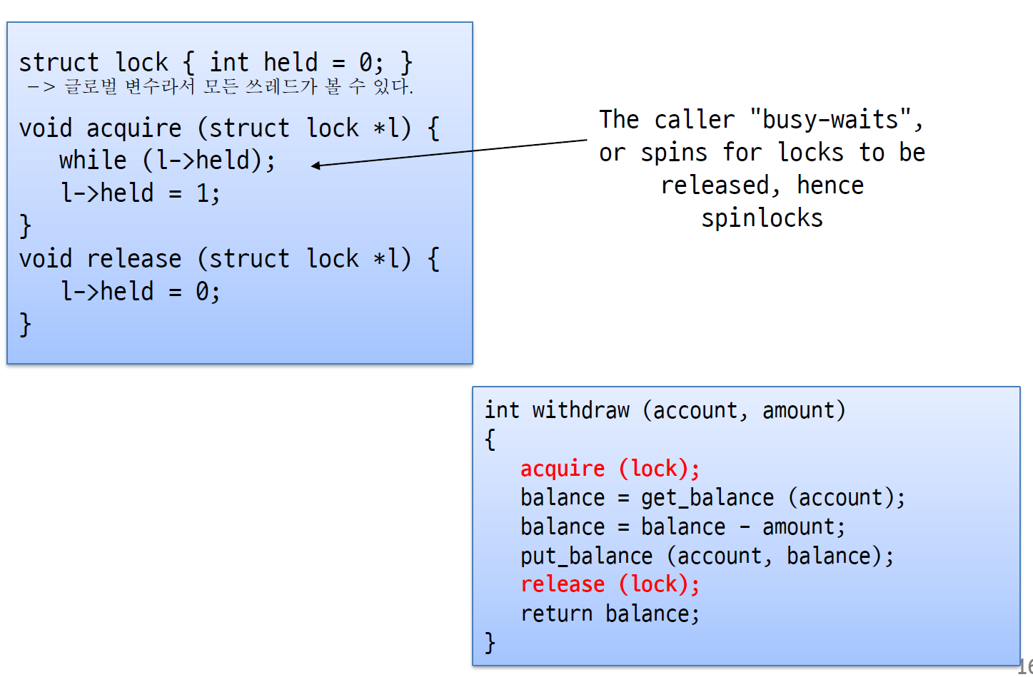 - T1이 release를 호출해서 held 값을 0으로 만들면 그때부터 T2가 크리티컬 섹션을 들어갈 수 있다.