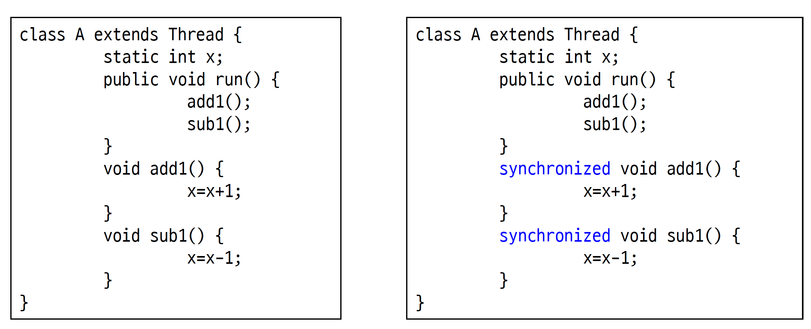 - 동기화 코드가 런타임에 컴파일러에 의해 추가된다. 크리티컬 섹션에 알아서 코드를 삽입해주는 방식이다.