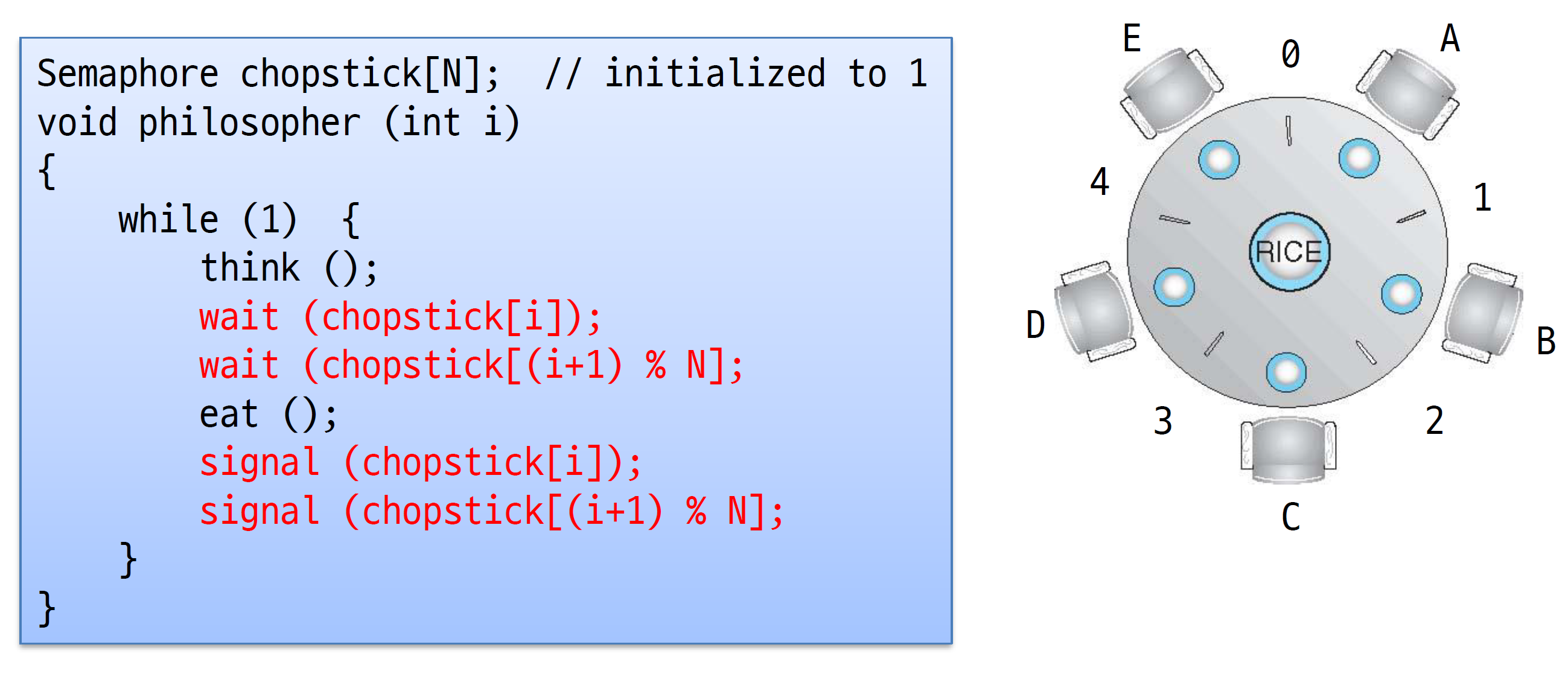 - 이런 상황에서 아래 그림과 같이 철학자들이 앉아있다면 어떤 방식으로 젓가락을 들어야 할까?