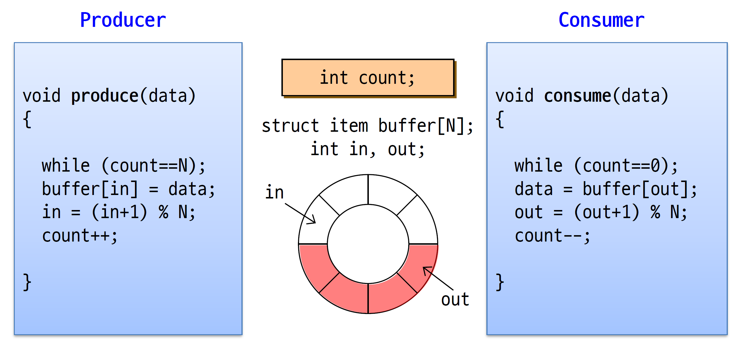 이 코드를 보면 당연하게도 버퍼를 공유하므로 문제가 된다. in과 out은 공유되고 있지 않아서 상관 없다. count는 공유되어서 또 문제가 된다. 특히 count++, count--는 어셈블리어로 세 줄이므로 문제가 된다.