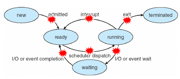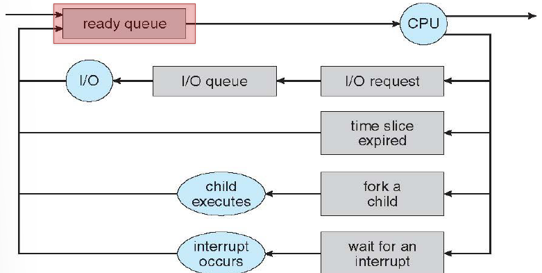 - 컨텍스트 스위치가 많이 일어나므로 CPU 스케줄러가 자주 일어나고, 그만큼 스케줄링이 빠르게 일어나야 한다.그림의 매 포인트마다 CPU 스케줄링이 일어난다.