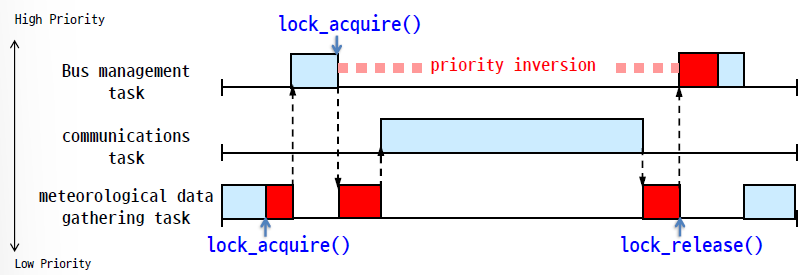 예시를 보면 bus management task가 lock때문에 한참동안 실행을 못한다. priority inversion이 일어나는 것이다. 이 문제를 해결하려면 두 가지 방법이 있다.