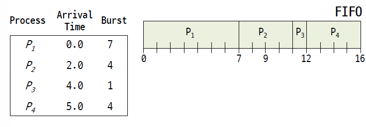 말 그대로 큐이다. 프로세스가 ready queue가 도착한 순서대로 실행시켜 주는 것이다. 얘는 보통 non-preemptive 방식으로 돌린다. 모든 job을 동등하게 대하고 당연히 starvation이 없다.