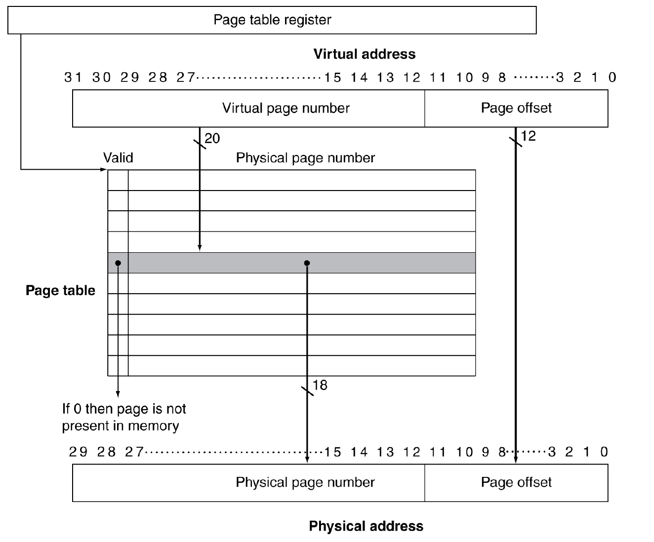 - 0이라면 페이지 테이블에 들어있는 프레임이 메모리에 없다거나 빈 공간이라는 등의 방식으로 유효하지 않은 걸 나타낸다. 보통 스와핑 때문에 메모리에 존재하지 않는 경우이다.