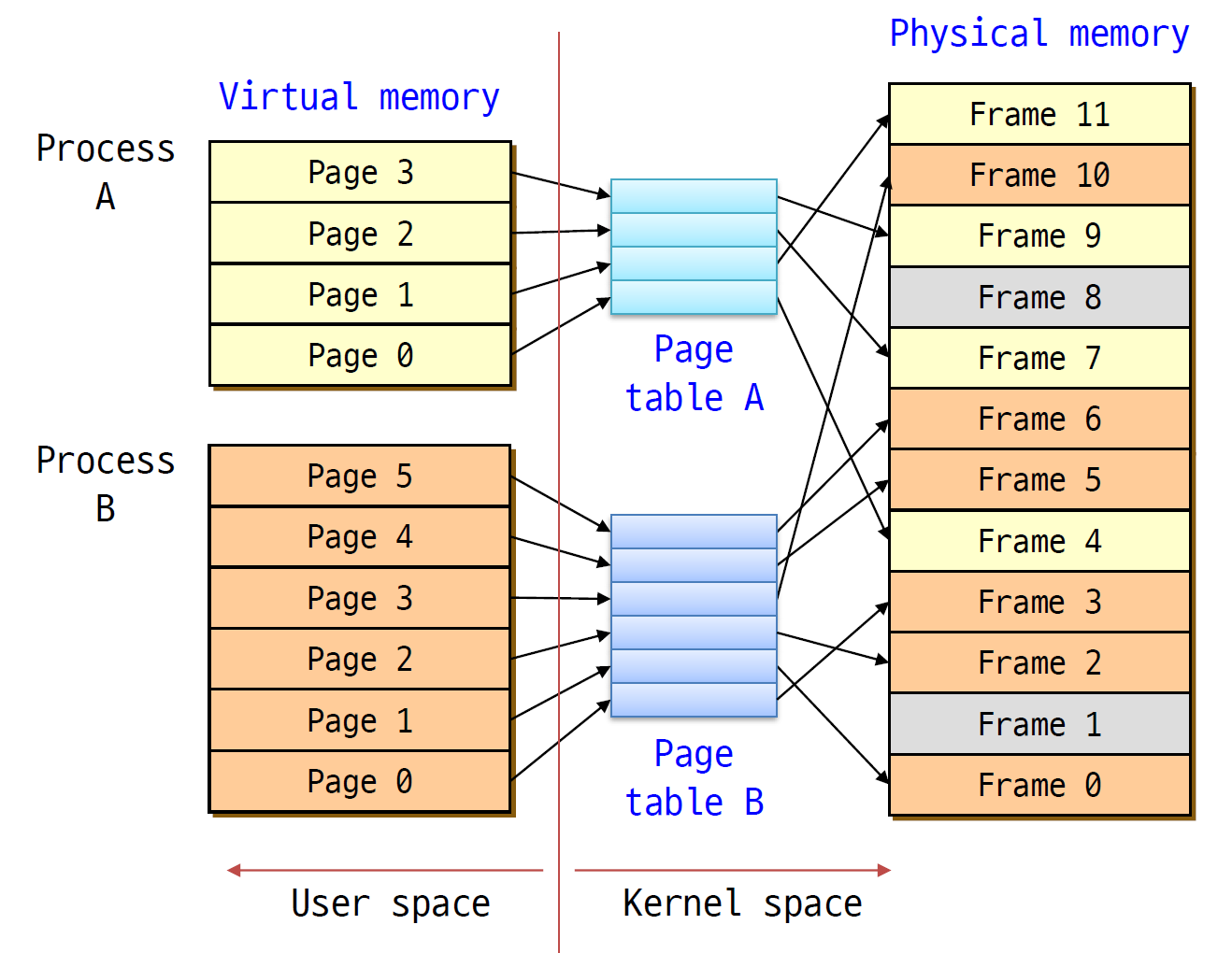 그리고 중간에 페이지 테이블을 만든다. 페이지 테이블은 프로세스별로 따로 만드는 것을 주의하자. TCB처럼 프로세스마다 페이지 테이블을 OS가 가지고 있다.