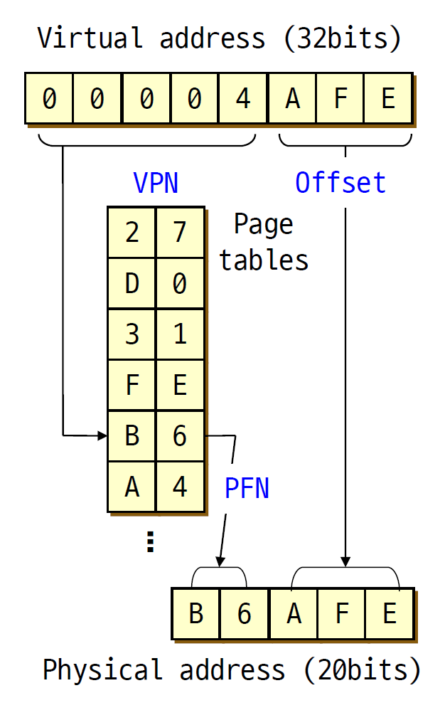 - 즉, <VPN::offset> → <PFN::offset, VPN → PFN>이다. FPN은 VPN으로 페이지 테이블에서 찾을 수 있다.