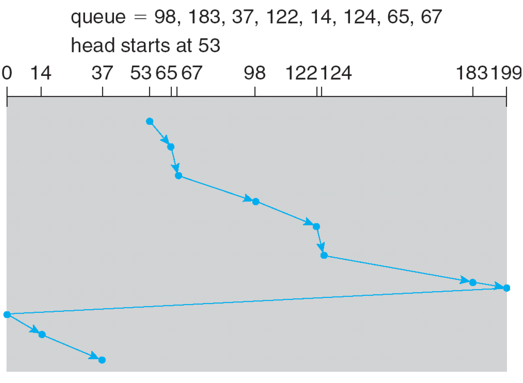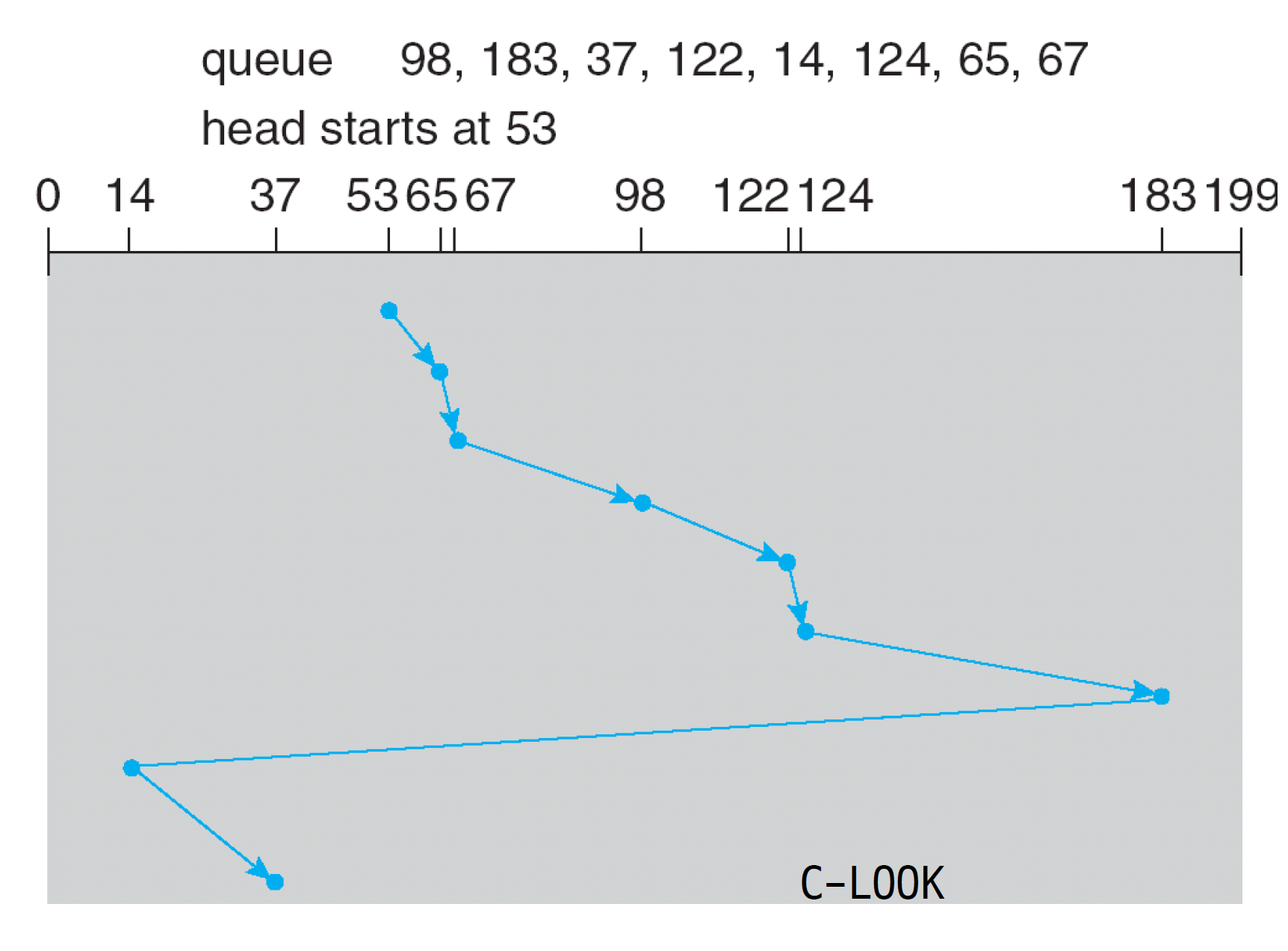 - 끝을 찍지 않고 183에서 반대 방향으로 진행(LOOK)하거나 다음 최솟값 요청으로 가는 것(C-LOOK)이다.