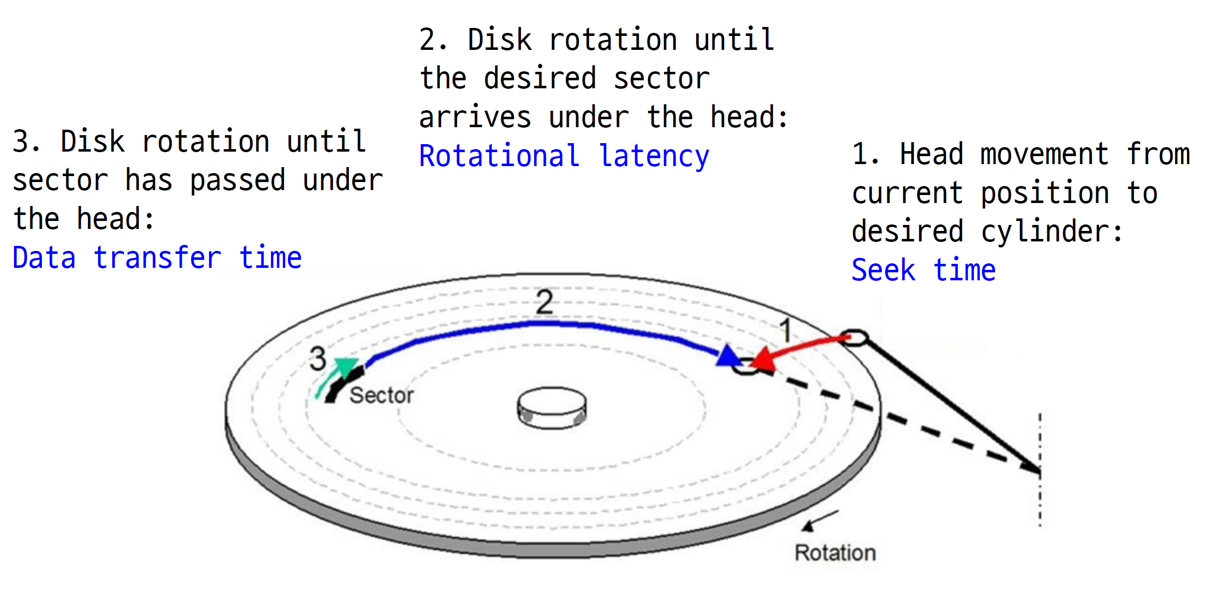 즉, seek은 트랙을 맞추는 시간, rotation은 디스크를 회전시켜서 섹션을 맞추는 시간, transfer은 읽어들이는 시간이다.