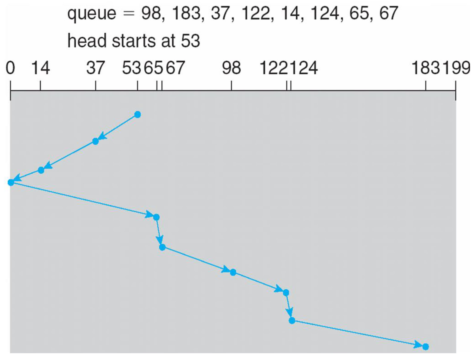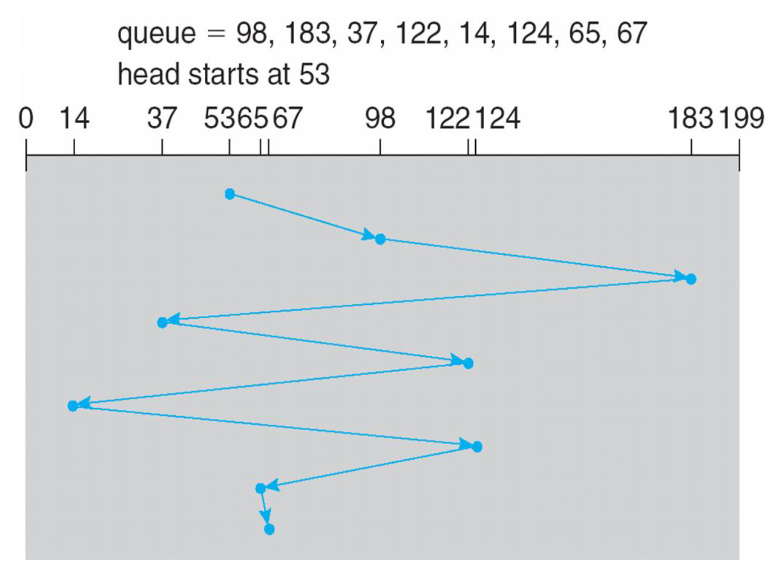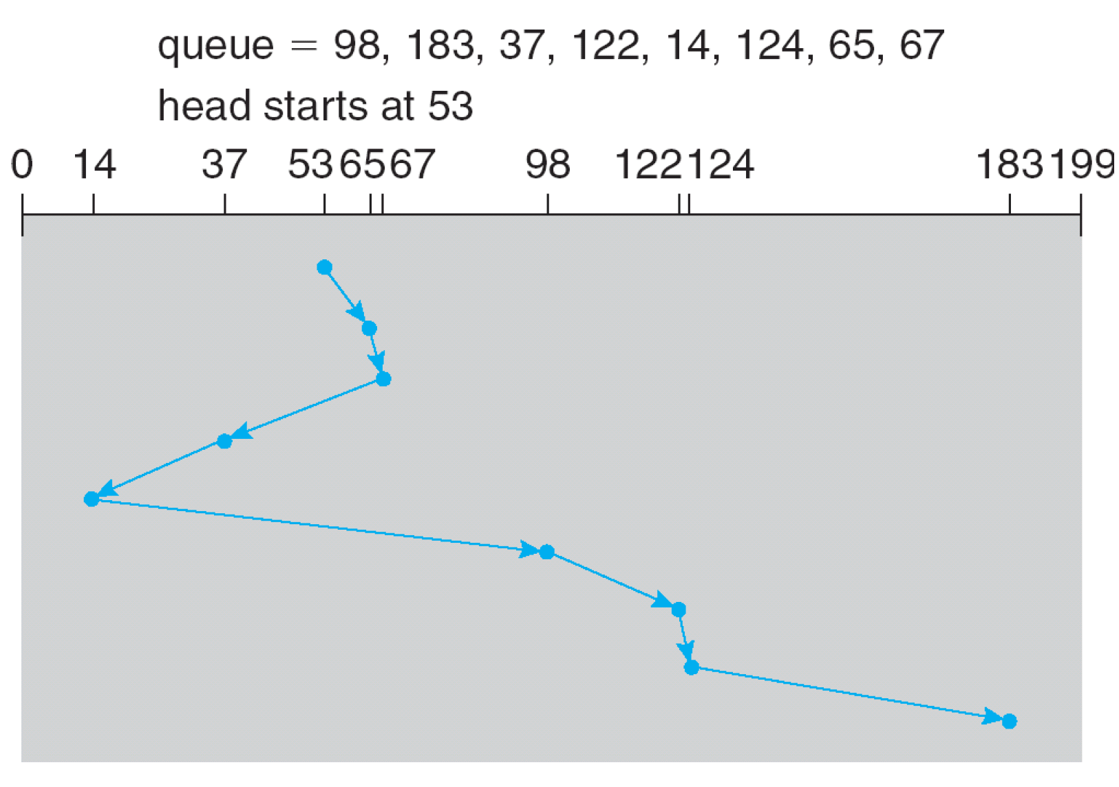 - 헤드가 53에서 가장 먼저 시작했다면 그다음 가장 가까운 65 67 37 14 … 이런 방식이다.