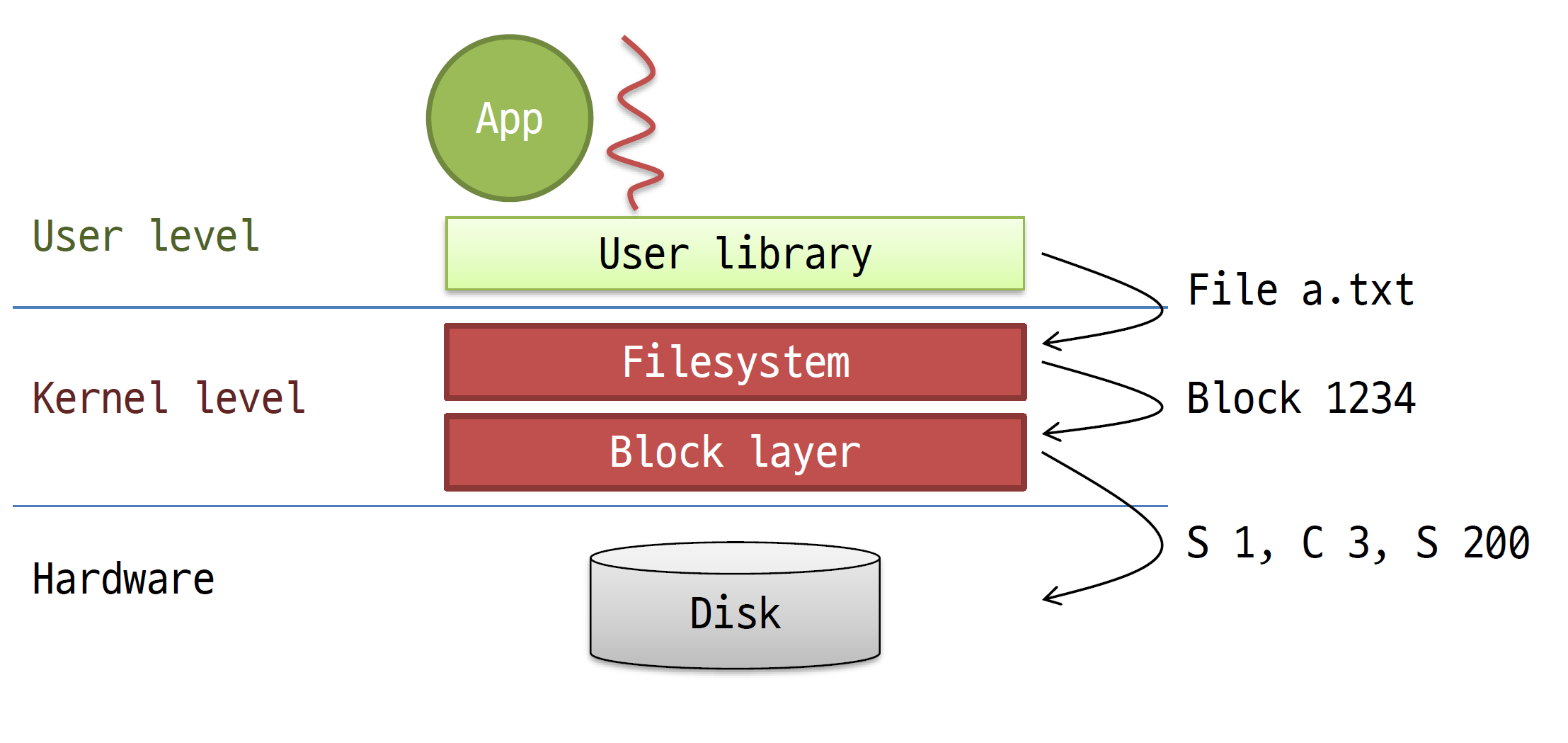 실제로 디스크에 엑세스하려면 OS는 표면, 실린더, 트랙, 섹터, transfer size 이런 정보를 다 포함해서 명령을 내려야 한다. file system과 block layer를 거쳐서 위의 정보들을 보내야 한다는 것이다.