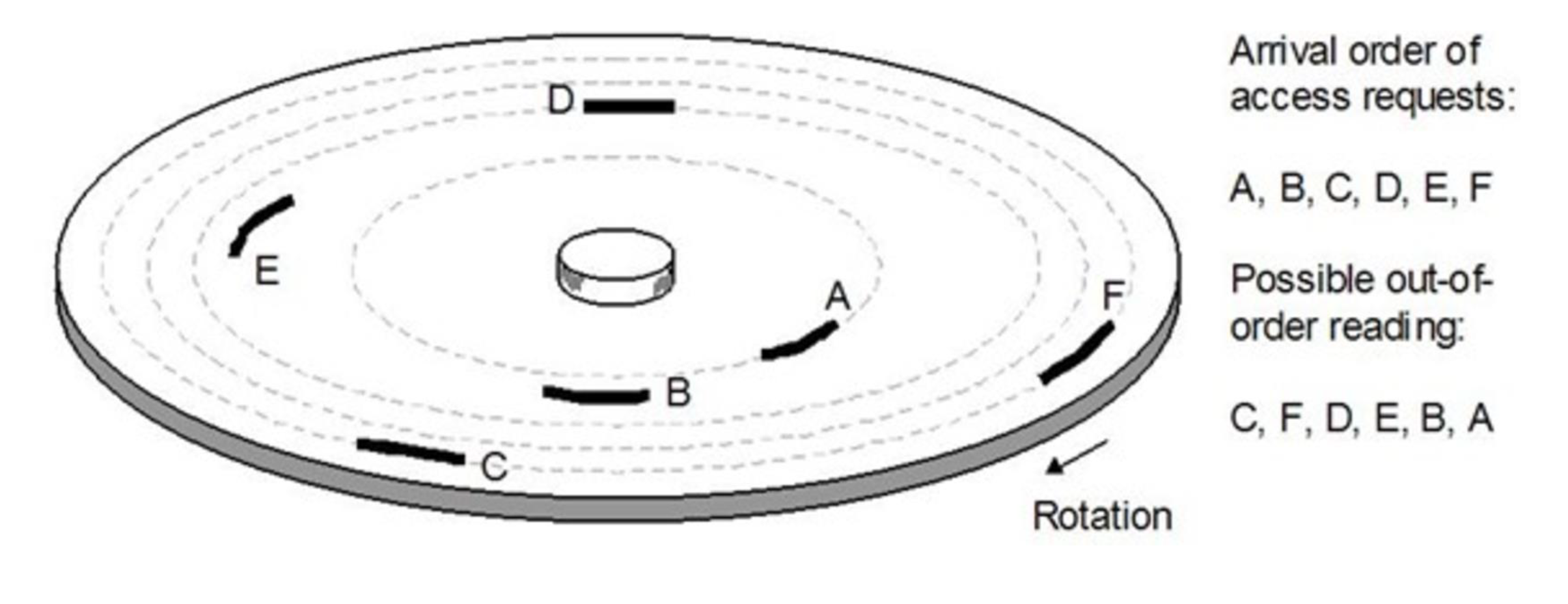 순서를 C F D E B A로 바꾼다면 seek이 왔다갔다하지는 않고 가장 바깥에서 안쪽으로 훑으면 되므로 seek 횟수가 줄어든다. 즉, 스케줄링에 따라 seek time이 바뀌게 된다.