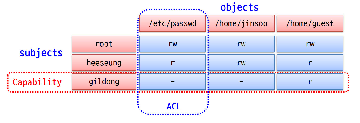 Capabilites : user를 기준으로 어떤 파일에 권한이 있는지 관리하는 것이다. 사진에서 row에 해당한다.