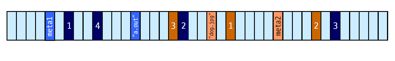 a.out, dog.jpg를 어떻게 디스크에 저장할 수 있을까? 만약 디스크의 블락 크기 하나가 512byte라면 파일을 512byte로 잘라서 저장한다. 파일의 metadata, file name 이런 식으로 블락 단위로 저장한다.