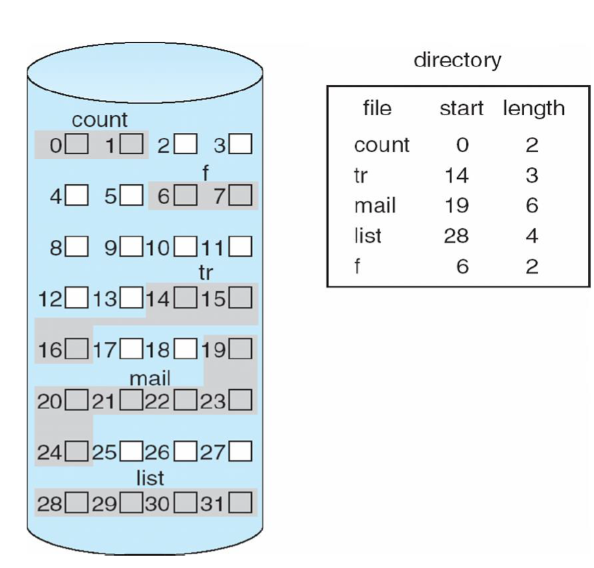 - 파일별로 필요한 길이만큼 연속된 blcok으로 할당한다.