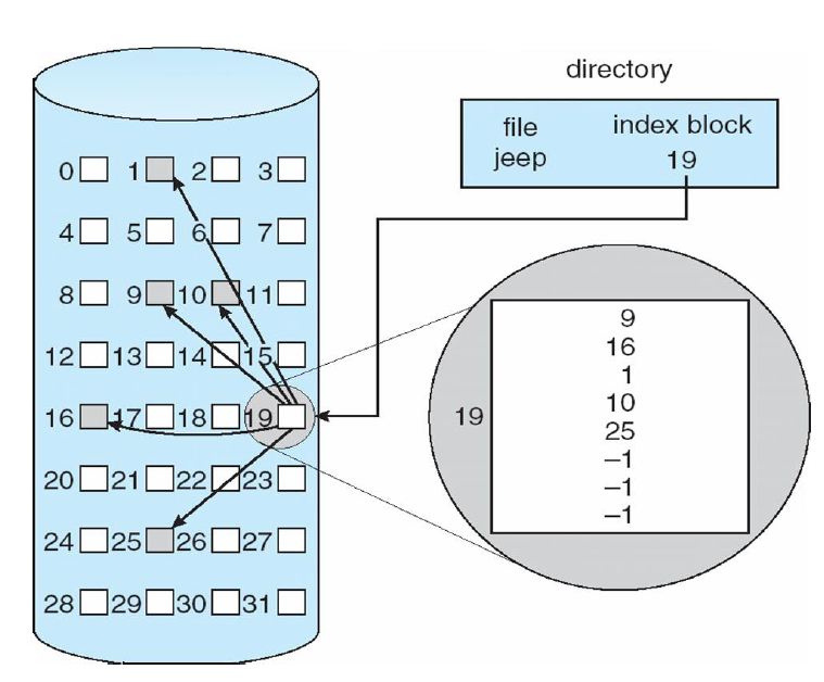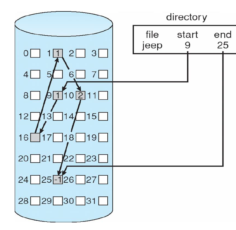 - 디렉터리 엔트리에 start block을 적어놓는다. start block에 file allocation tabe, FAT의 start block가 link 되어 있고 FAT를 따라서 다음 blcok을 찾는다.