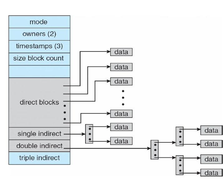 direct block을 위한 blcok을 정해놓고 바로 접근할 수 있다. dircect block으로 부족하면 single indirect가 있어서 거기에 접근하면 direct block이 존재한다. double에 가면 single이 또 있다.