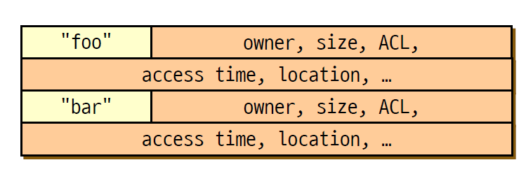 a디렉터리에 b, c, d가 있으면 해당 디렉터리는 파일 이름과 파일 속성을 가지고 있다. 어떻게 metadata를 저장하는지는 주로 세 가지 방식이 존재한다.