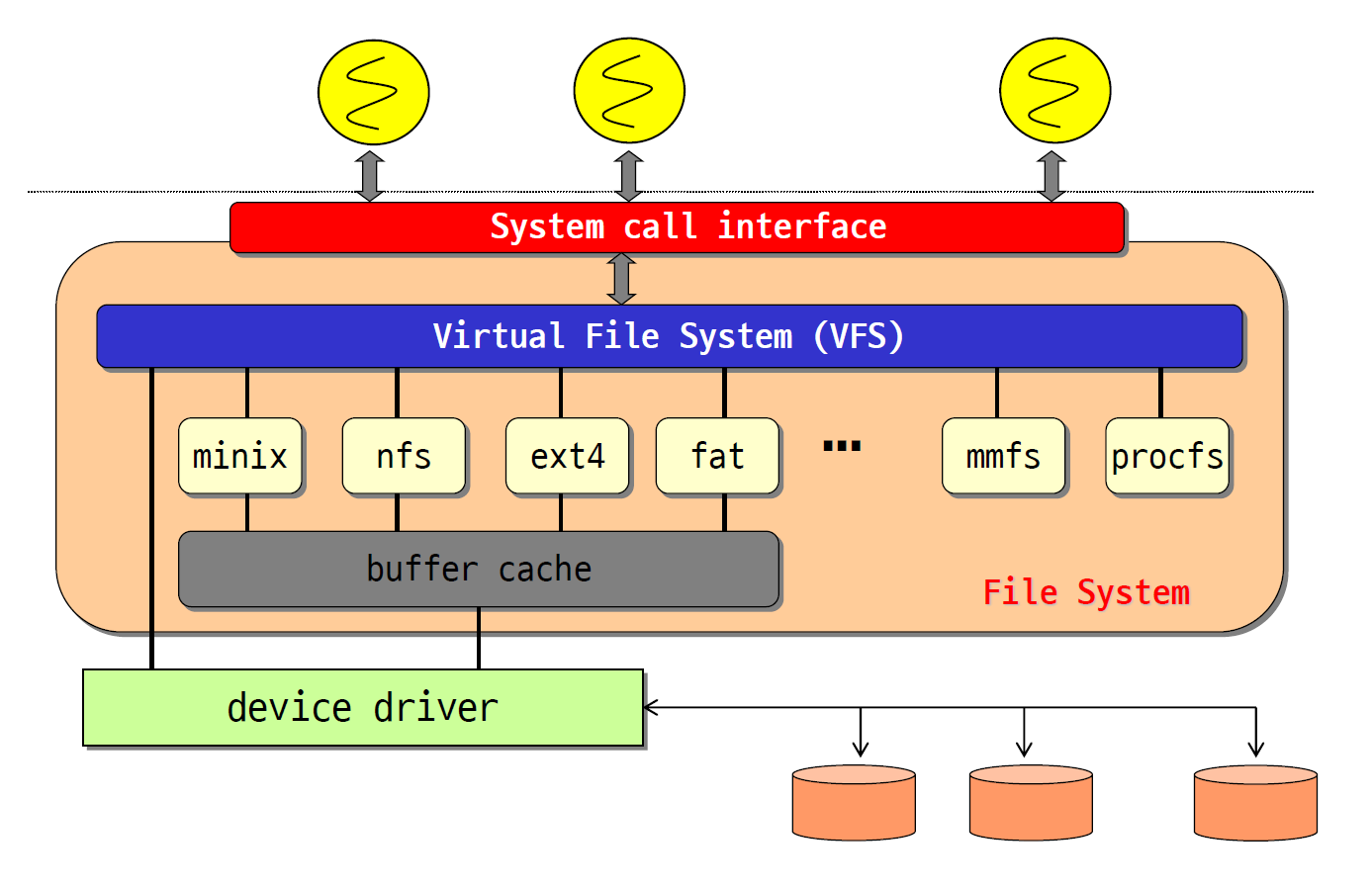 - 내가 오픈하고 싶은건 a.txt이지 a.txt가 ext4에 저장되어 있는지 nfs에 저장되어 있는지 그런 건 알고 싶지 않다. 따라서 a.txt를 open system call을 호출하면 system call interface가 받고 그 명령을 VFS로 보내고 마운트 포인터를 보고 해당 파일의 위치를 확인한 뒤 디스크에서 읽게 된다.