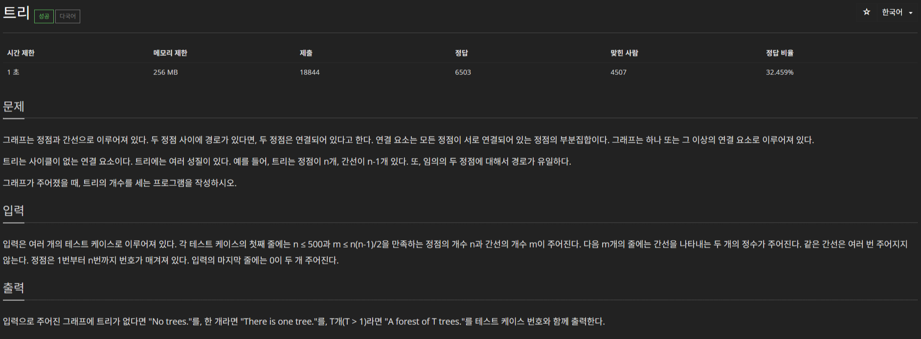 주어진 그래프에서 트리가 몇 개 존재하는지 판단하는 문제이다.