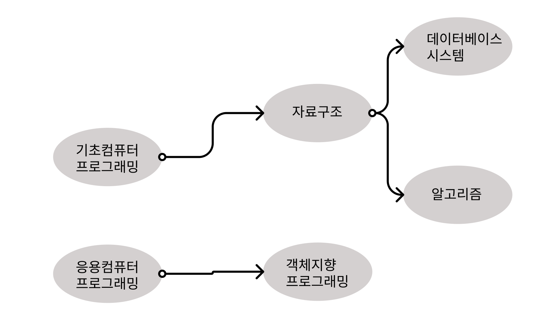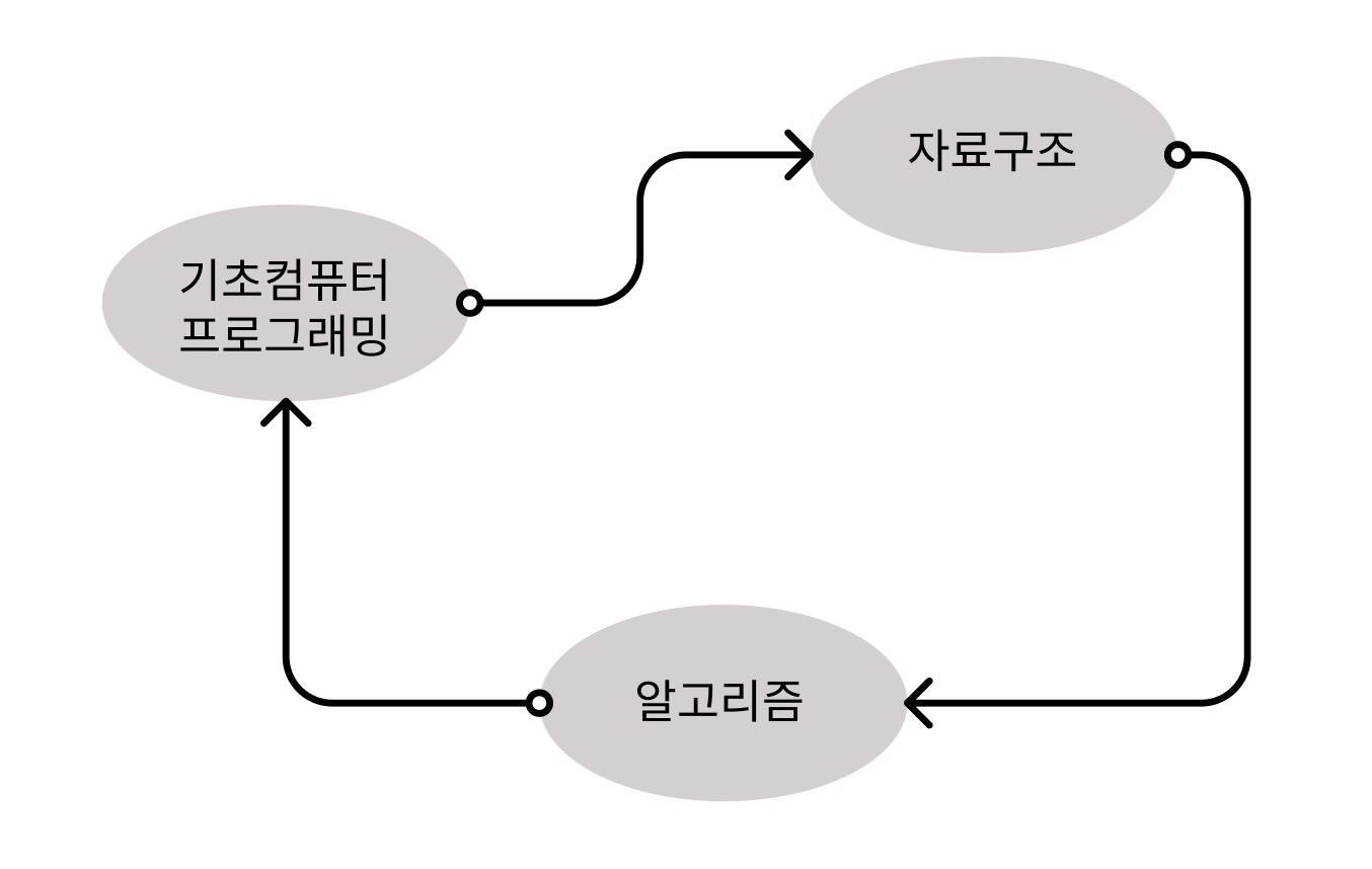 - 기초컴퓨터 프로그래밍 -> 응용컴퓨터 프로그래밍 -> 객체지향 프로그래밍 -> 자료구조 -> 데이터베이스시스템 -> 알고리즘
