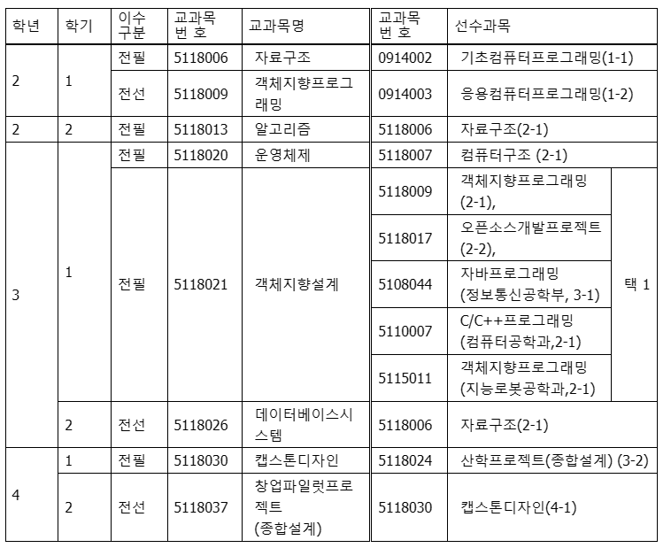 - 기초컴퓨터 프로그래밍 -> 자료구조 -> 데이터베이스시스템 -> 알고리즘 -> 응용컴퓨터 프로그래밍 -> 객체지향 프로그래밍