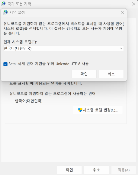 제어판 -> 시계 및 국가 -> 국가 또는 지역 -> 관리자 옵션 -> 시스템 로캘 변경 -> Beta : ~~ 체크!