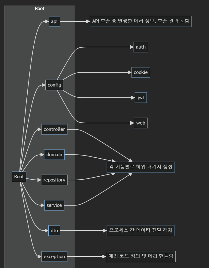 api 패키지와 exception 패키지는 시간이 없어서 사용하지 않았다. 이것도 결과론적으로 보면 에러, 호출 결과들을 정의해놓고 가는게 더 빨랐을 것 같지만 아쉬운 부분이다.