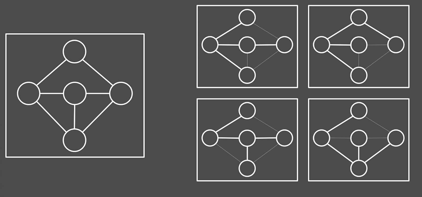 사진의 왼쪽 그래프에서 오른쪽 그래프는 모두 신장 트리이다. 신장 트리라 하면 당연히 연결 그래프가 되겠고, 트리이므로 당연히 사이클이 존재해선 안된다.