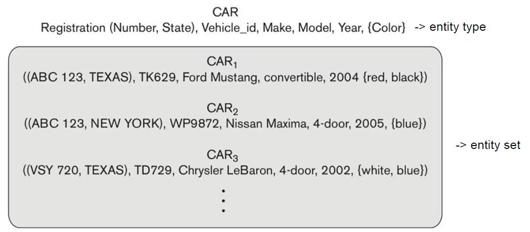 같은 속성을 갖는(값이 같다는 게 아님) entity 집합이 entity set이 되고 집합에 대한 이름이 entity type name이 된다.