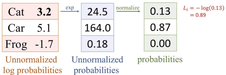 - 얻은 score들을 unnormalized log probabilities로 보고 exponential을 취해서 unnormalized probabilities를 구한다. 예를 들어 e^3.2로 바꾸는 것이다.