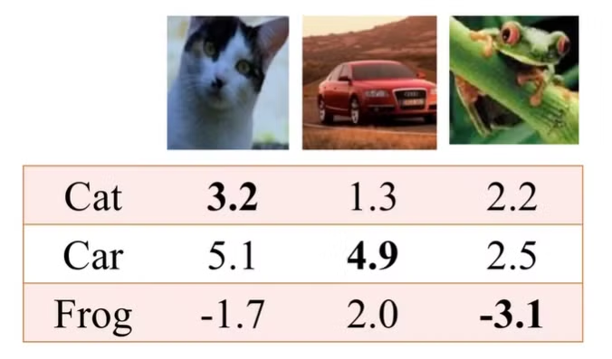 고양이 사진에 대해 W를 내적한 score 값은 [3.2, 5.1, -1.7]이다.