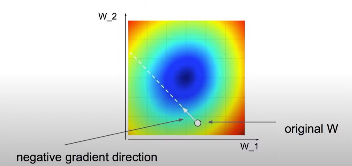 흰색 화살표가 가리키는 방향은 negative gradient 방향으로, 손실이 감소하는 방향이다. 이 방향으로 이동하면 손실 함수의 값이 점점 작아지게 되고, 최종적으로 최솟값에 수렴하게 된다.