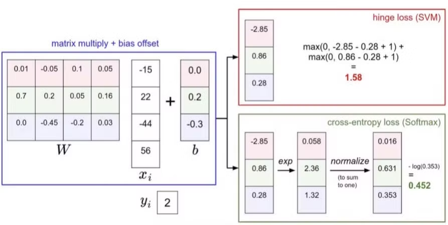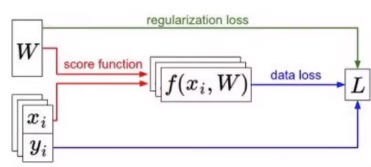 weight W와 이미지 입력값인 x_i를 통해 score function을 계산할 수 있고 loss는 score function의 값과 실제 정답인 y_i를 이용해서 계산할 수 있다.