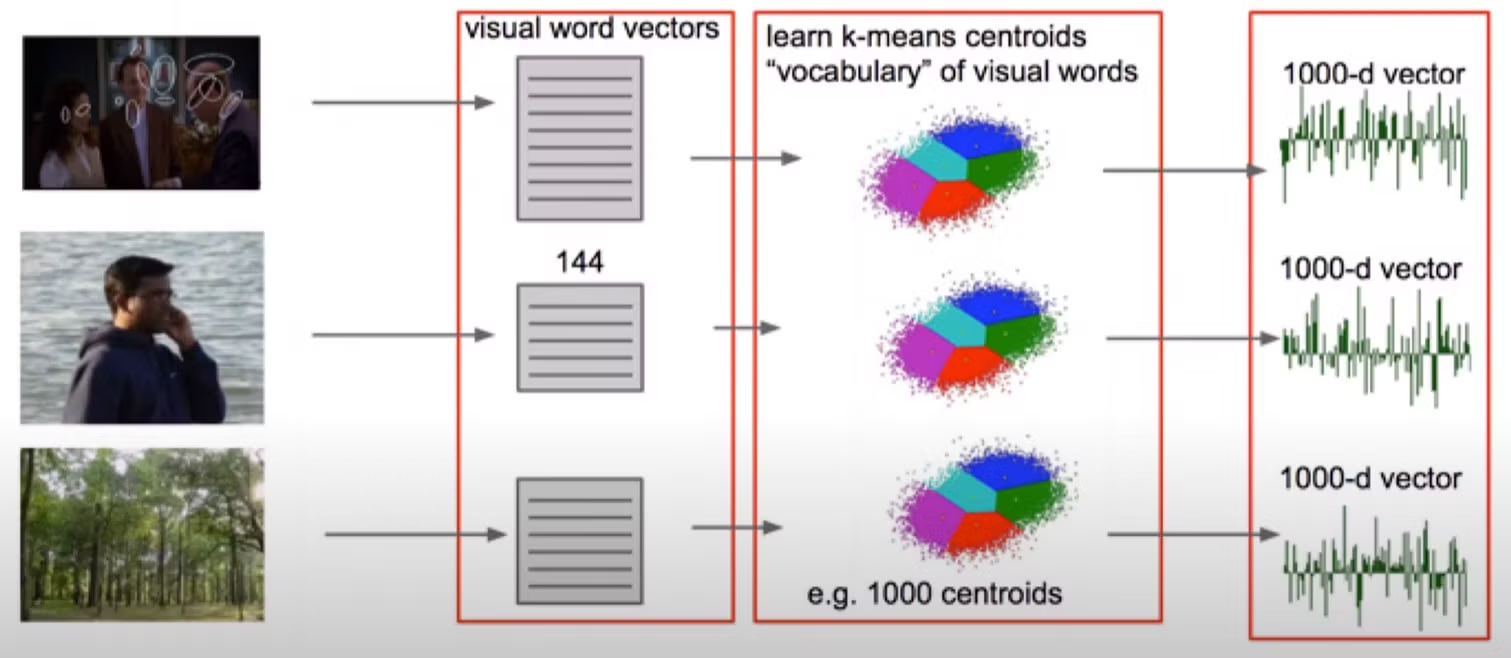 각각의 raw 이미지를 visual word vector로 표현하기 위해 숫자로 이루어진 벡터 형태로 임베딩 하는 방법이다. 임베딩 한 후 k-means 알고리즘으로 1000 개의 중심점을 갖도록 학습시킨다. 그럼 각 이미지에 해당하는 visual word들을 1000 차원의 벡터로 표현할 수 있다.