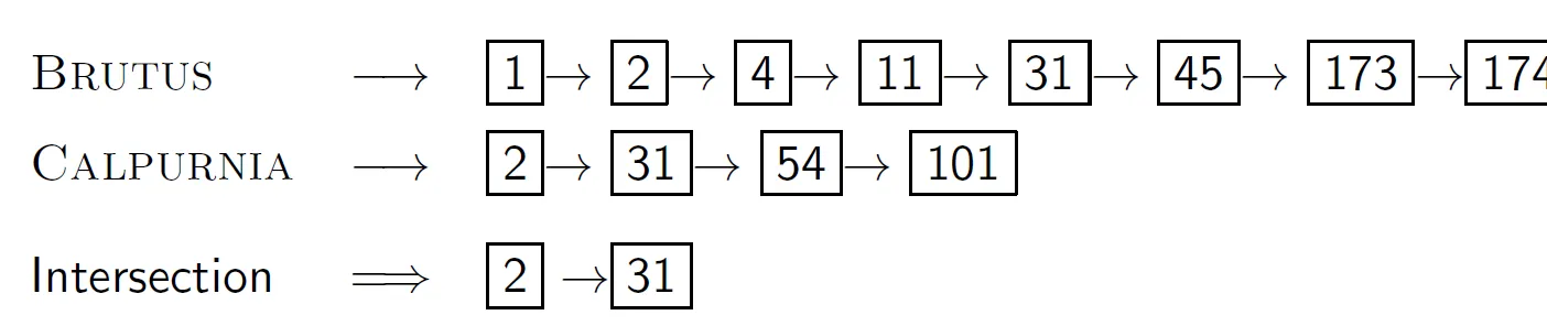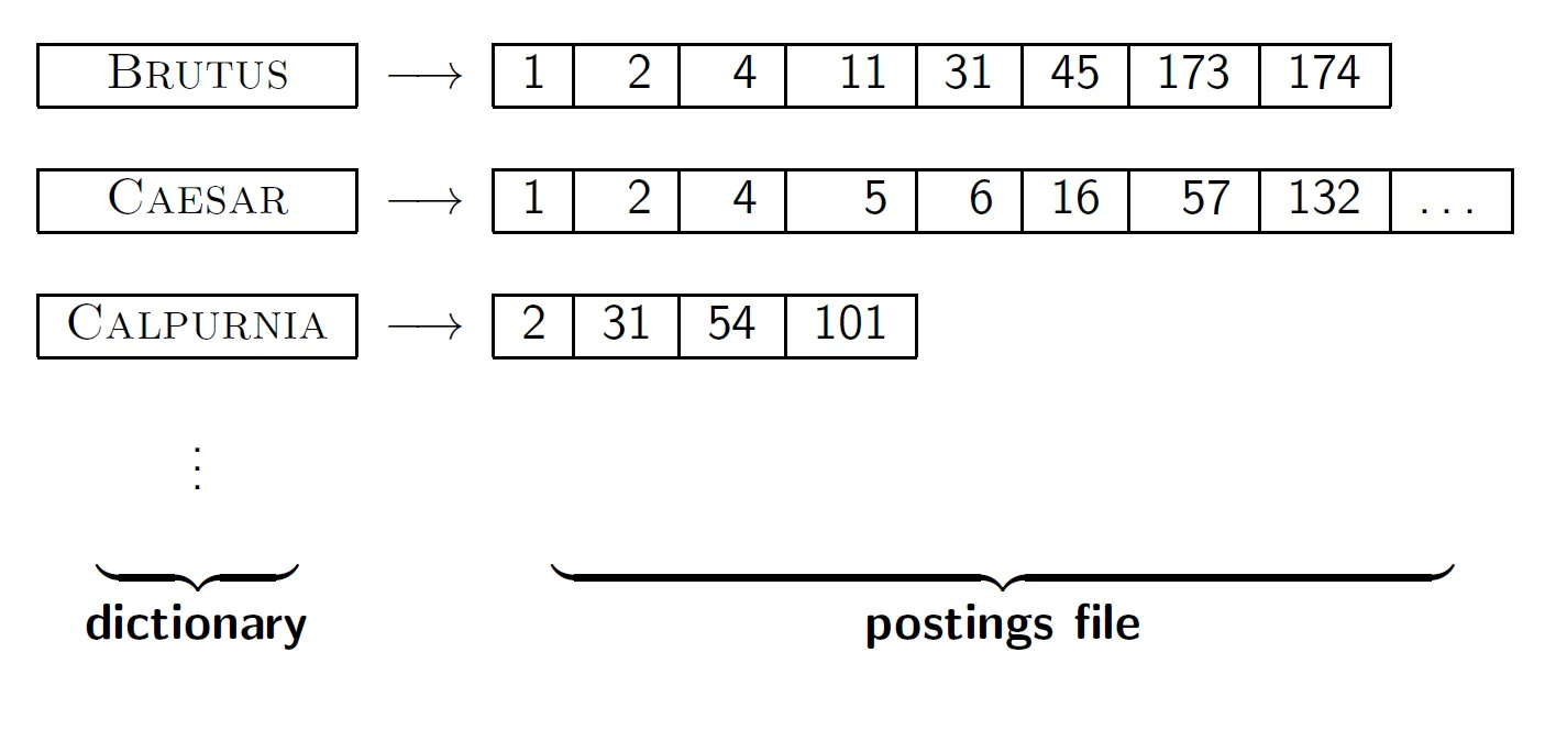 - BRUTUS AND CALPURNIA에 대해 각 단어에 대한 postings file을 뽑아낸다.