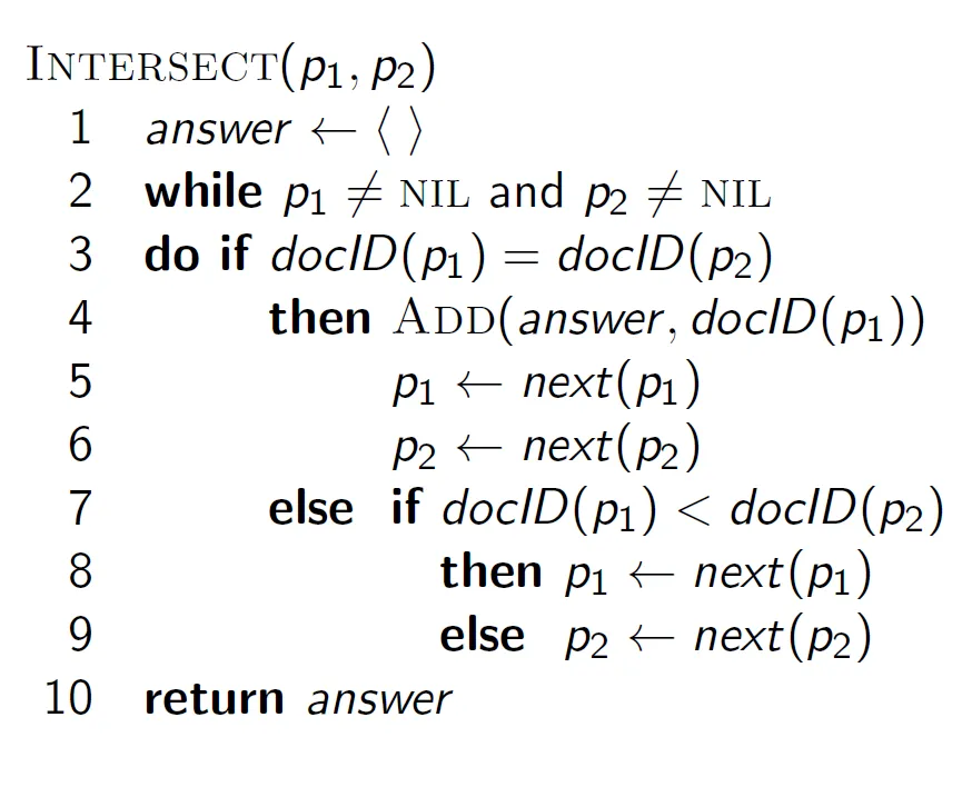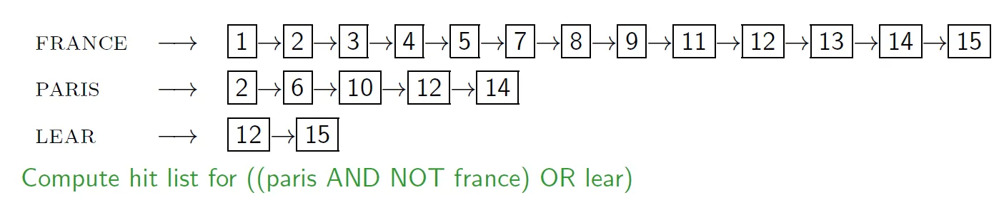 term docuemnt incidence matrix는 term에 대해서 벡터를 뽑아서 AND 연산을 수행하면 된다. 하지만 inverted index에서는 쉽지 않다. bit operation으로 하려니까 bit가 너무 많이 든다. 따라서 다른 로직을 가지고 검색해야 한다.
