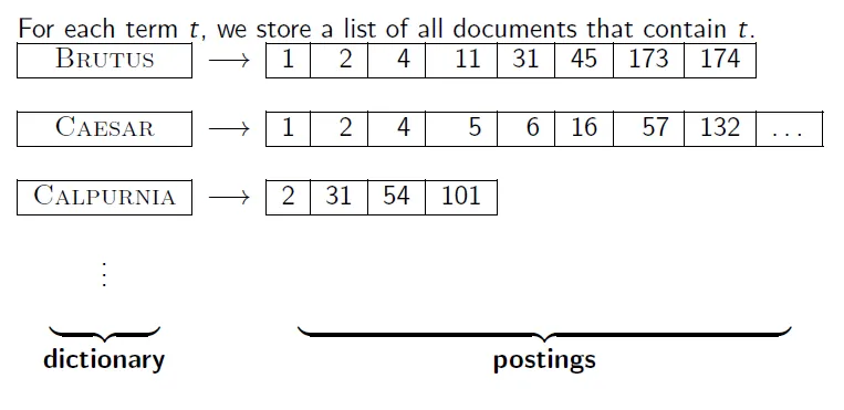 Inverted Index의 기본 구조는 왼쪽에 term, dictionary가 있고 오른쪽에 postings, 문서 번호의 집합이 존재한다. Inverted Index를 생각하면 바로 위의 구조가 떠올라야 한다!